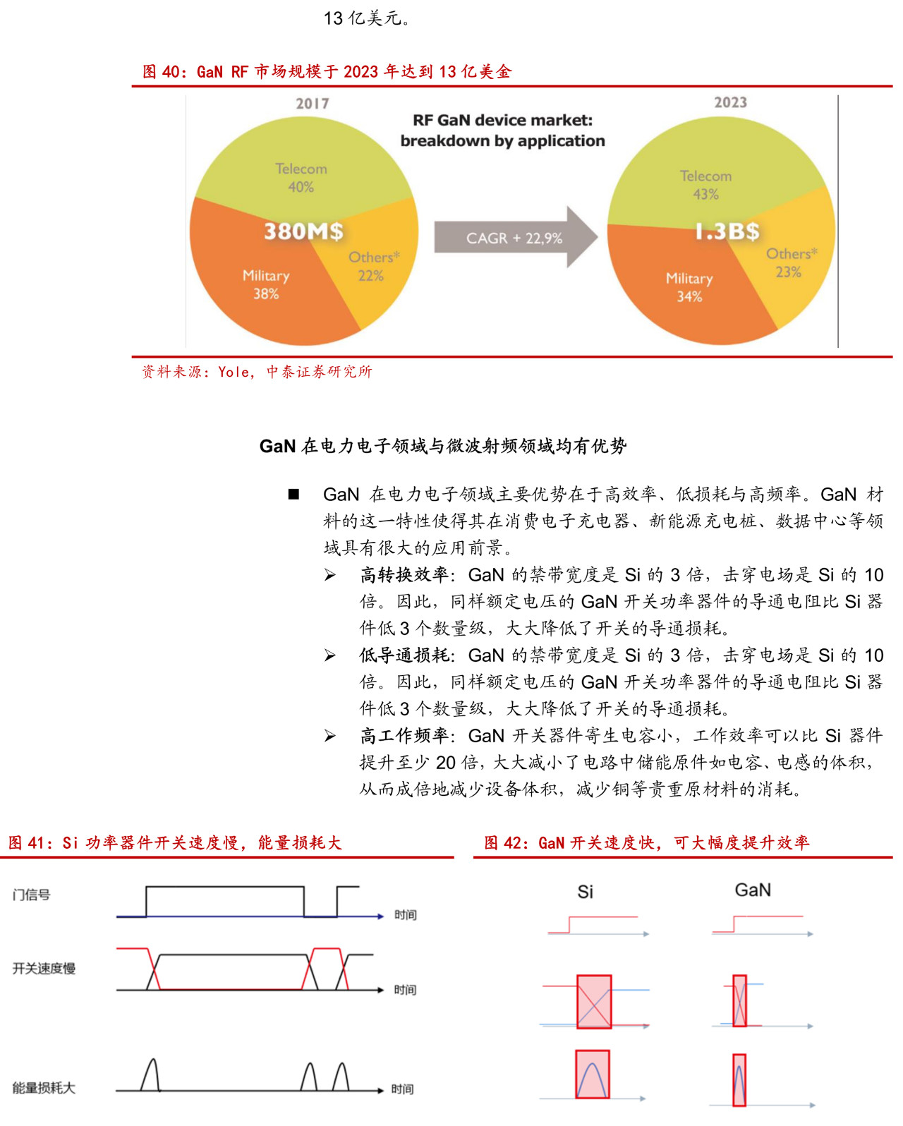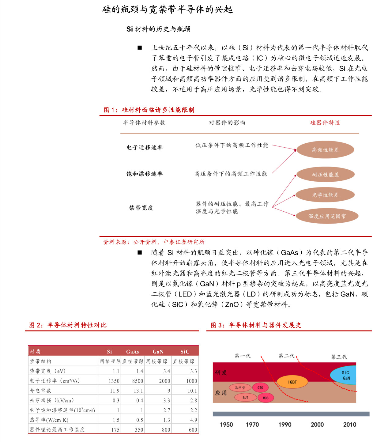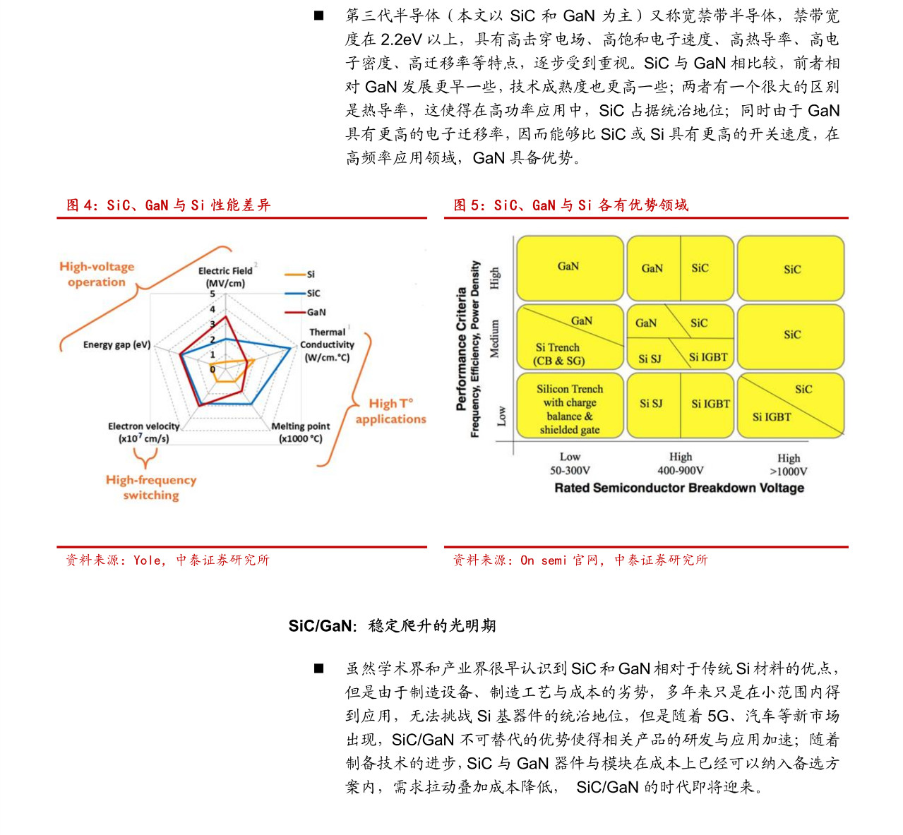 突破 Si 的瓶颈,SiC/GaN 具备性能上的优势。Si 作为集成电路最基础的材料,构筑了整个信息产业的最底层支撑。人类对 Si 性能的探索已经非常成熟,然而一些固有的缺点却无法逾越,如光学性能、高压高频性能等。与此同时所谓第三代半导体(宽禁带半导体)以其恰好弥补 Si 的不足而逐步受到半导体行业青睐,成为继 Si 之后最有前景的半导体材料。
